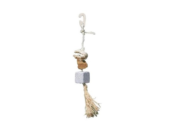Přírodní závěsná hračka s brusným pemzovým kamenem se sisalem, kukuřičným listem, lufou a rafií, poskytuje zábavu, podporuje přirozené chování a zvídavost, pomáhá při obrušování hlodáků
