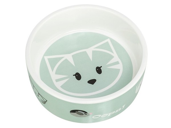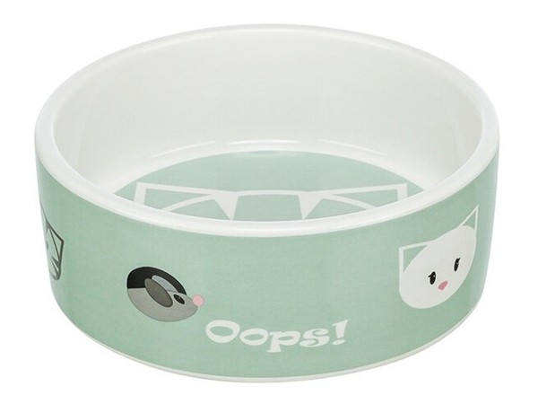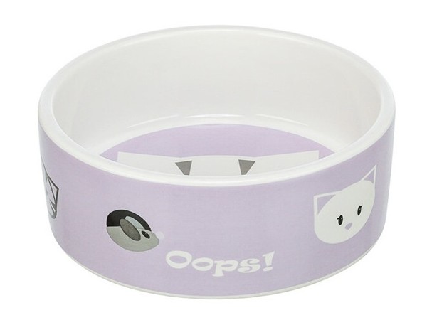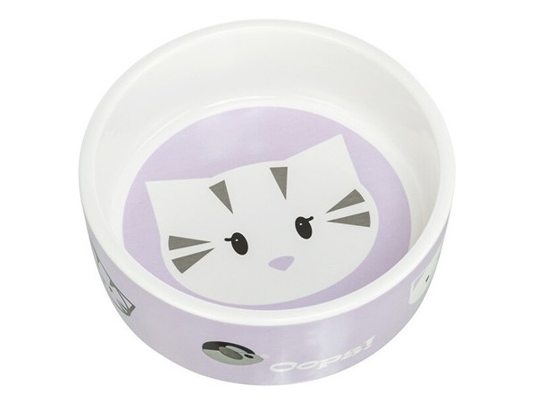 Keramická miska s motivem kočičí hlavy uvnitř, po obvodu je několik malých kočičích hlaviček a myška, dostupné v pastelově zelené a fialové barvě, objem misky je 300 ml a průměr 12 cm